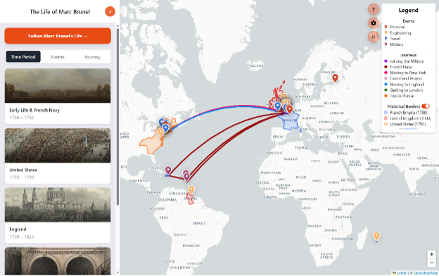 The map, available here on our website, allows you to choose between free exploration and choosing to learn more about events in Marc Brunel’s life that especially interest you, or following Brunel’s travels chronologically using the sidebar to navigate. Each pin on the map corresponds to an event in Marc Brunel’s life, and clicking on a pin will display a description of the event and their significance. The map is complete with a tutorial to show you the different features and how they can be used. The map acts as both a way for people to learn about Marc Brunel’s life and travels and as a repository for Brunel Museum research.
